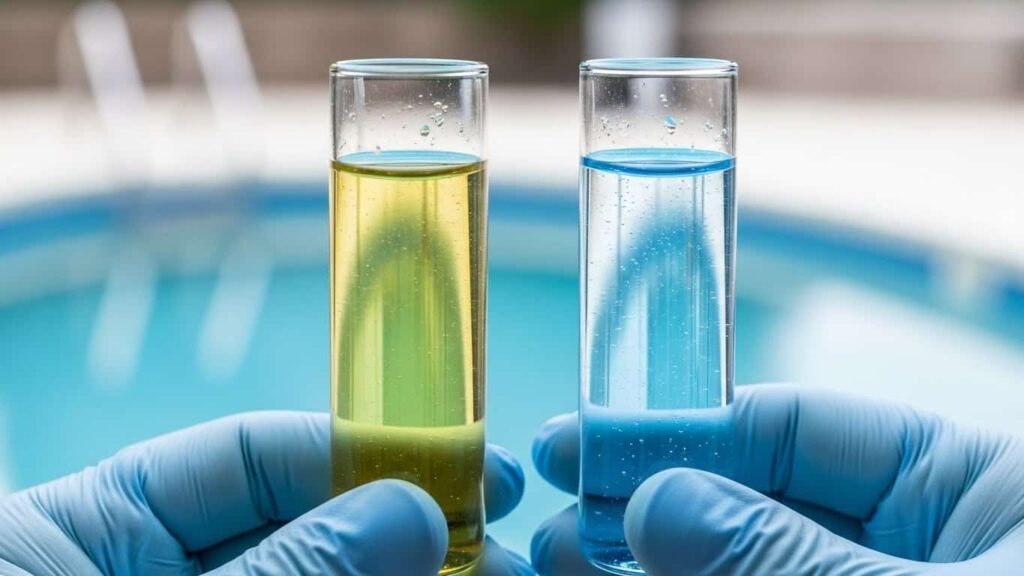 Em piscinas descobertas é comum usar cloro estabilizado (dicloro/tricloro). Ele protege o cloro do sol — ótimo. O problema: com o tempo o CYA (ácido cianúrico) pode subir demais. Nesse cenário, você mede cloro e “parece que está tudo certo”, mas o cloro fica menos disponível para agir com força sanitizante e o controle da água fica difícil.