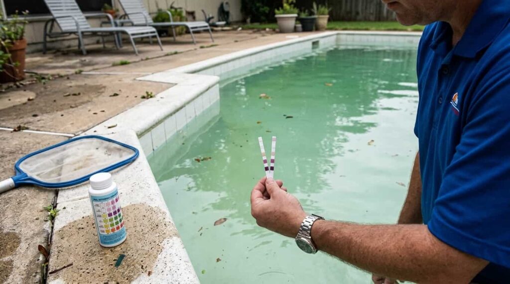 E aí começa o ciclo vicioso: o cloro está alto no teste, mas a água fica turva, aparece alga, tem cheiro estranho. O síndico manda colocar mais cloro. Não resolve. Mais cloro. Continua igual. É o que muita gente chama de “cloro travado” — o estabilizante em excesso não deixa o cloro agir com velocidade suficiente para matar os microrganismos.
