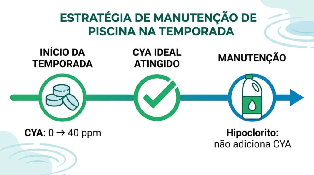 Uma estratégia comum é usar pastilhas de tricloro no início da temporada, até o CYA subir para 30-40 ppm, e depois manter a cloração com hipoclorito — que é mais barato e não eleva o estabilizante.
