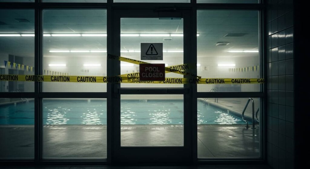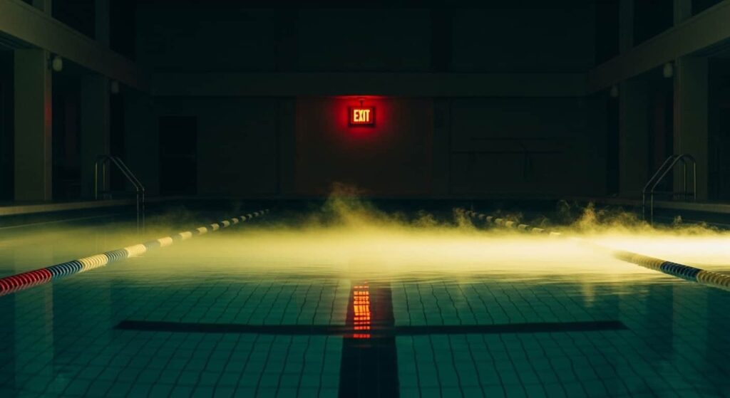 A piscina ficava em um espaço fechado. O gás cloro, mais denso que o ar, se concentrou rente à superfície da água. O CDC da Califórnia documentou padrão idêntico em acidentes entre 2008 e 2015: ambientes fechados amplificam drasticamente o risco de intoxicação.