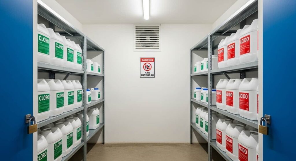 • Armazenar produtos separados. Ácidos e produtos à base de cloro devem ficar em locais diferentes, ventilados, longe de calor e de acesso de pessoas não autorizadas.