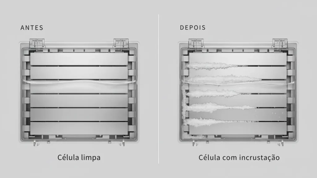 O inimigo mais comum da célula é a incrustação: depósitos de carbonato de cálcio (escama) que se formam quando a água tende à precipitação de cálcio, principalmente com pH alto, alcalinidade elevada e dureza cálcica alta.